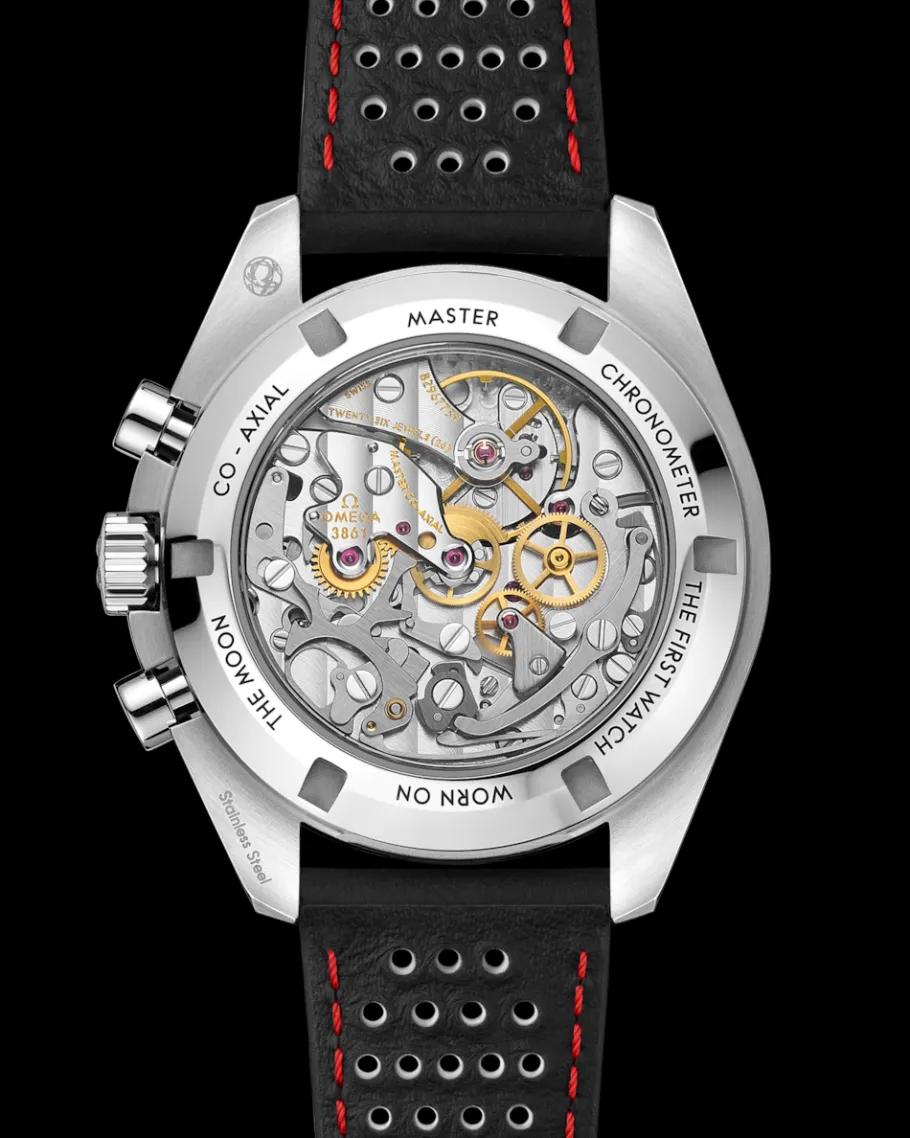 La montre est animée par le calibre OMEGA Co-Axial Master Chronometer 3861, qui alimente le compteur de petite seconde, le compteur des 30 minutes et le compteur des 12 heures, en plus de sa fonction chronographe centrale.