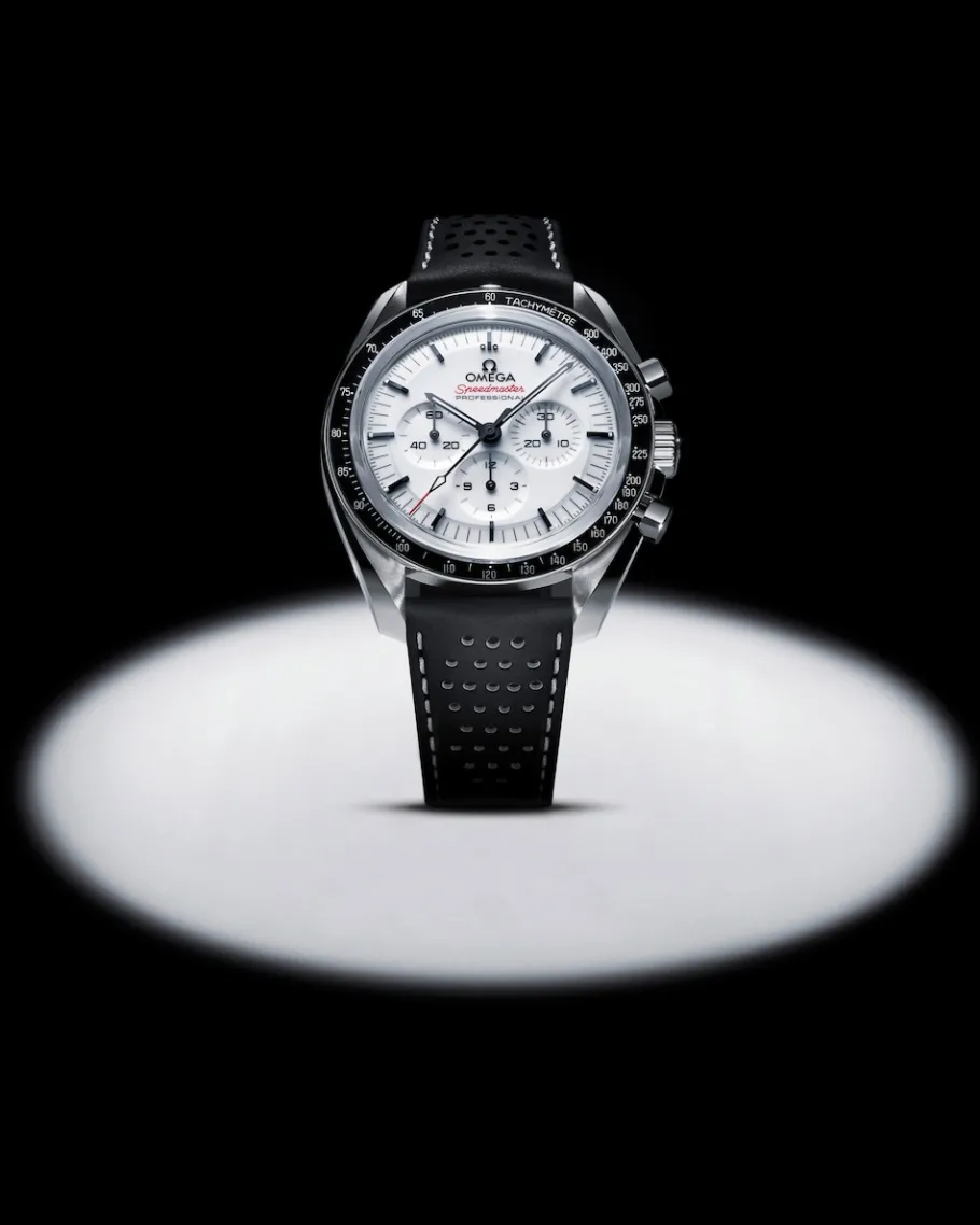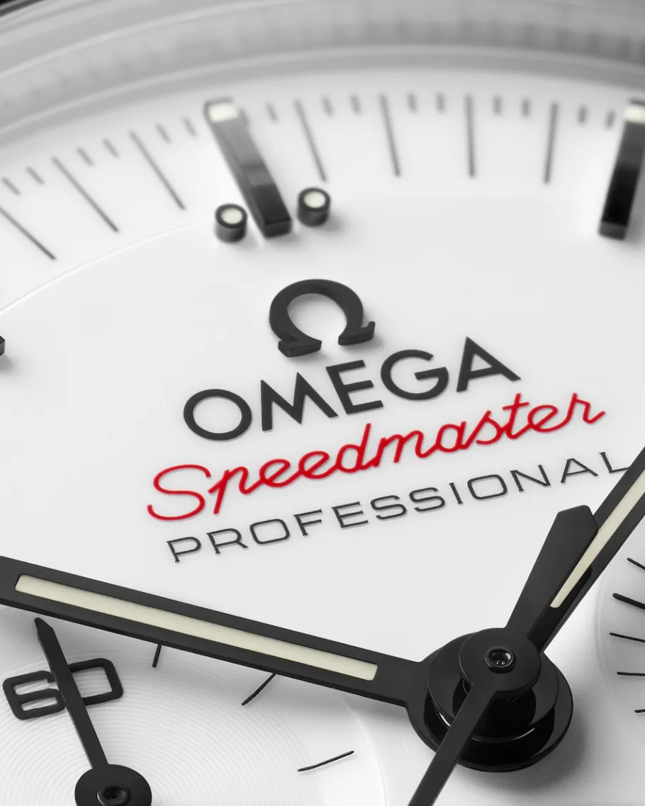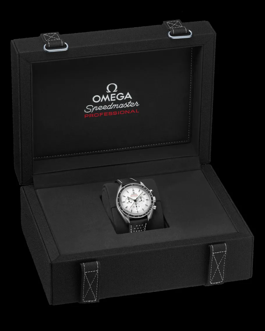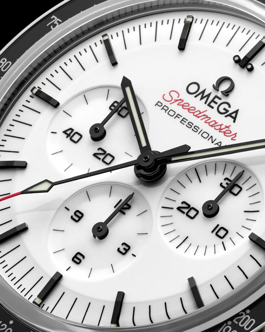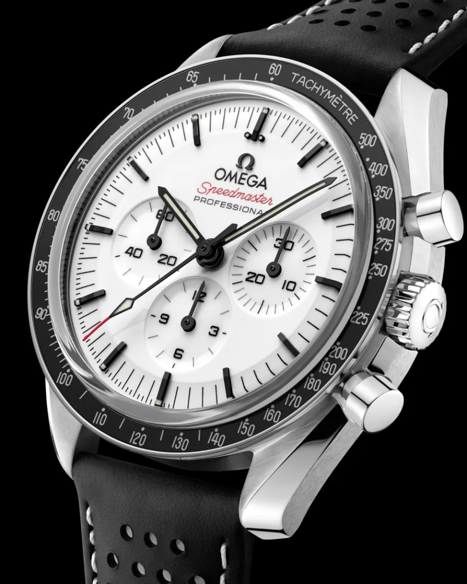 Cette Moonwatch de 42 mm en acier inoxydable est montée sur un bracelet en cuir noir micro-perforé avec des surpiqûres blanches et rouges. Elle présente un verre saphir sur l’avant comme sur le fond de boîtier. Inspirée de la Speedmaster 4e génération portée sur la Lune, cette montre au boîtier asymétrique arbore un cadran à étage laqué blanc, rehaussé du logo OMEGA et d’index appliqués, ainsi que des aiguilles style « Moonwatch ». La lunette noire en aluminium anodisé est quant à elle frappée du point signature au-dessus du chiffre 90.