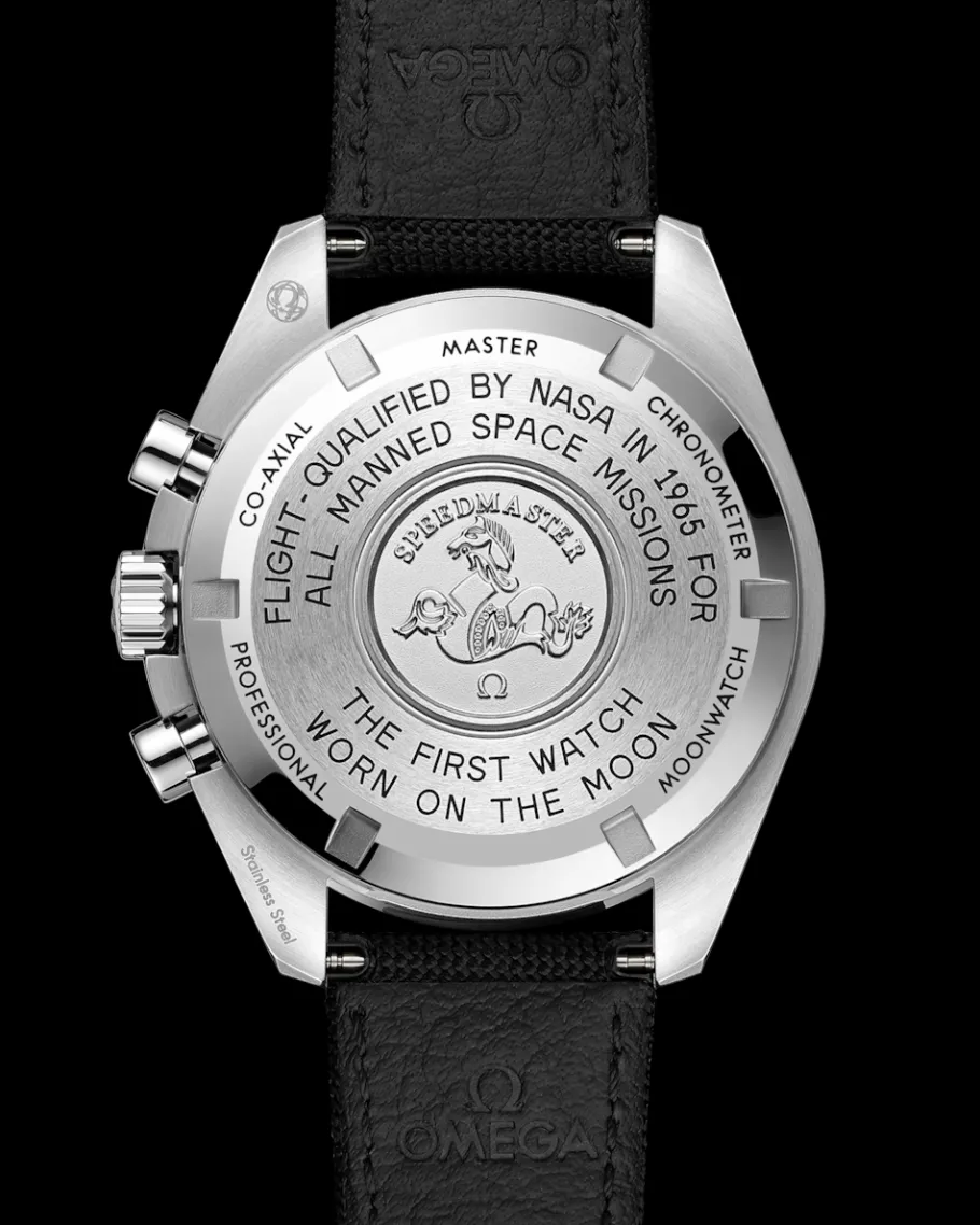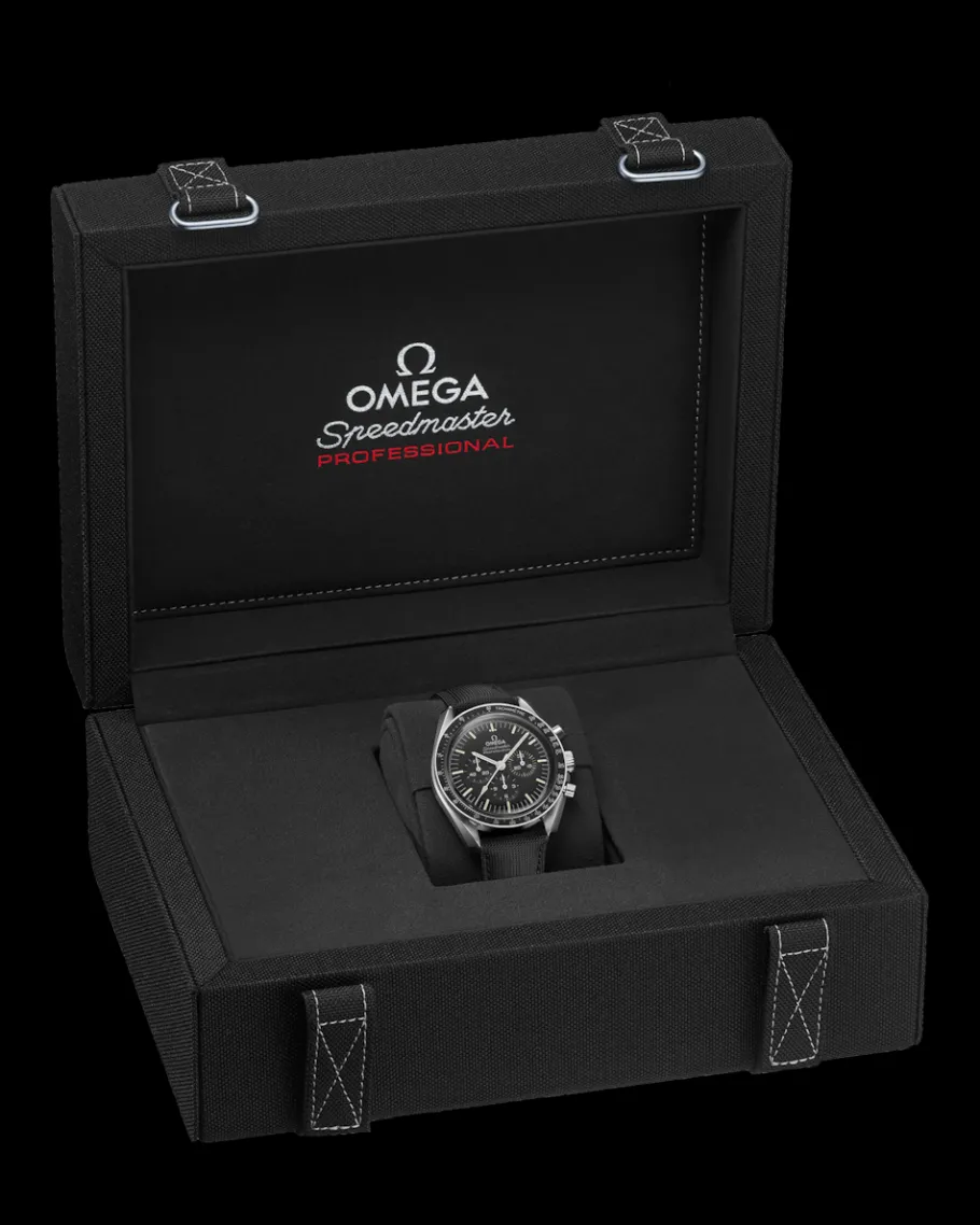 Cette Moonwatch de 42 mm en acier inoxydable est montée sur un bracelet en nylon. Elle présente un verre hésalite sur l’avant et un médaillon représentant l’hippocampe OMEGA sur le fond de boîtier. Inspirée de la Speedmaster 4e génération portée sur la Lune, cette montre au boîtier asymétrique arbore un cadran noir à degrés. La lunette en aluminium anodisé est quant à elle frappée du point signature au-dessus du chiffre 90.