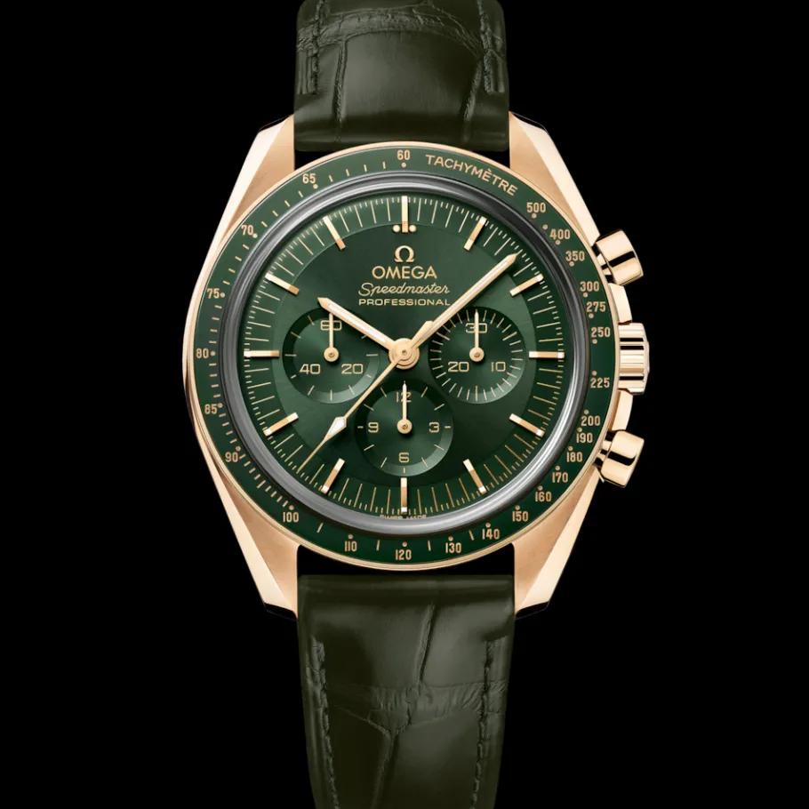 Inspirée de la Speedmaster 4e génération, cette Moonwatch de 42 mm en or Moonshine™ 18K arbore un cadran à étage soleillé en PVD vert et des aiguilles de style « Moonwatch ». Sa lunette en céramique verte, dotée d’une échelle tachymétrique en Ceragold™ OMEGA, est frappée du point signature au-dessus du chiffre 90. Cette Moonwatch est proposée avec un bracelet en cuir vert dont la boucle est en or Moonshine™ 18K.