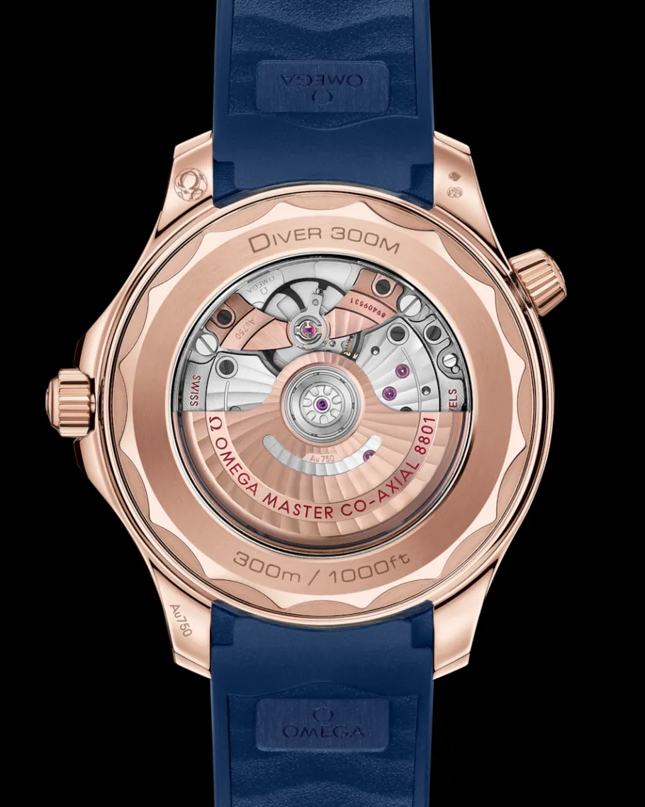 La montre est présentée sur un bracelet en caoutchouc bleu et entraînée par le calibre OMEGA Master Chronometer 8801, que l’on peut admirer à travers le fond en verre saphir à bords ondulés.
