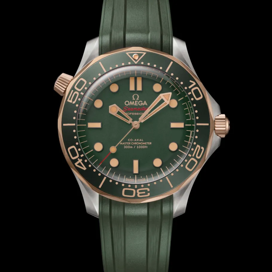 Ce modèle de 42 mm est fabriqué en titane grade 2 et Bronze Gold 9K, un matériau exclusif signé OMEGA. Il est surmonté d’une lunette en aluminium anodisé oxalique vert avec échelle de plongée en Super-LumiNova vintage.