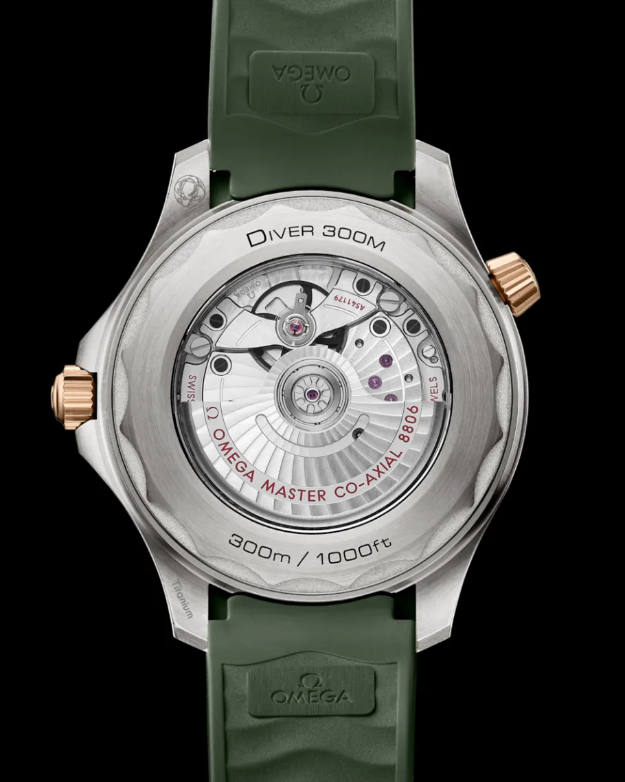 La montre est présentée sur un bracelet en caoutchouc vert intégré à boucle déployante. Elle est entraînée par le calibre OMEGA Co-Axial Master Chronometer 8806, que l’on peut admirer à travers le fond en verre saphir.