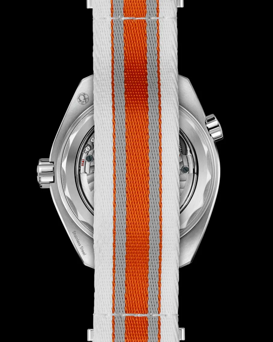 La montre se distingue également par son fond vissé au design alvéolaire et son bracelet NATO rayé orange, gris et blanc en polyamide, avec boucle et passants en acier inoxydable poli.