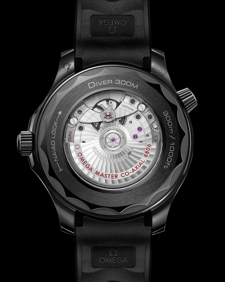 Un bracelet en caoutchouc noir intégré avec boucle en céramique noire vient parfaire ce modèle. Un fond de boîtier ouvrant directement sur le mouvement vient offrir un contraste lumineux à l’ensemble. Le calibre OMEGA Co-Axial Master Chronometer 8806 est également visible à travers le fond de boîtier en verre saphir à bord ondulé.