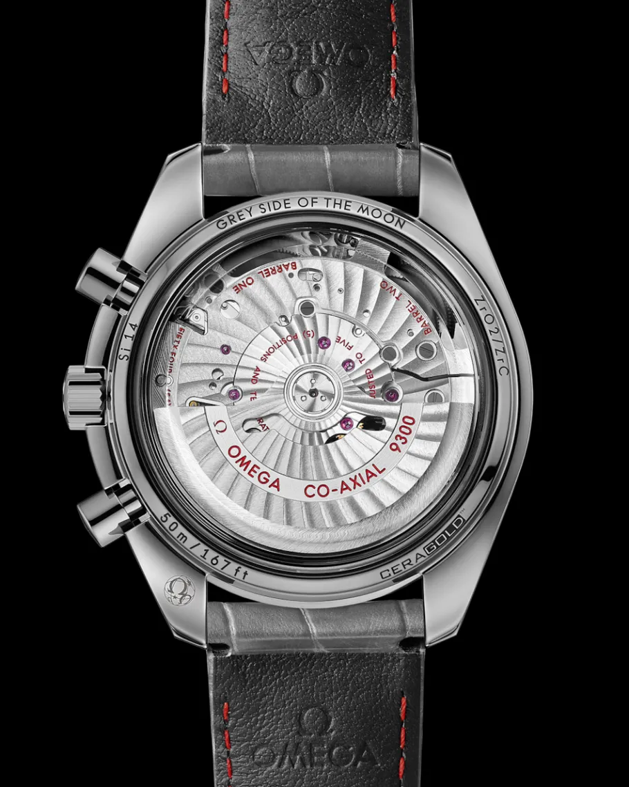 Dans un style qui rappelle ses légendaires devancières, la Speedmaster Grey Side of the Moon « Météorite » possède un compteur 12 heures et 60 minutes à 3 heures et une petite seconde à 9 heures. Le calibre OMEGA Co-Axial 9300 est visible à travers le fond en verre saphir biseauté.