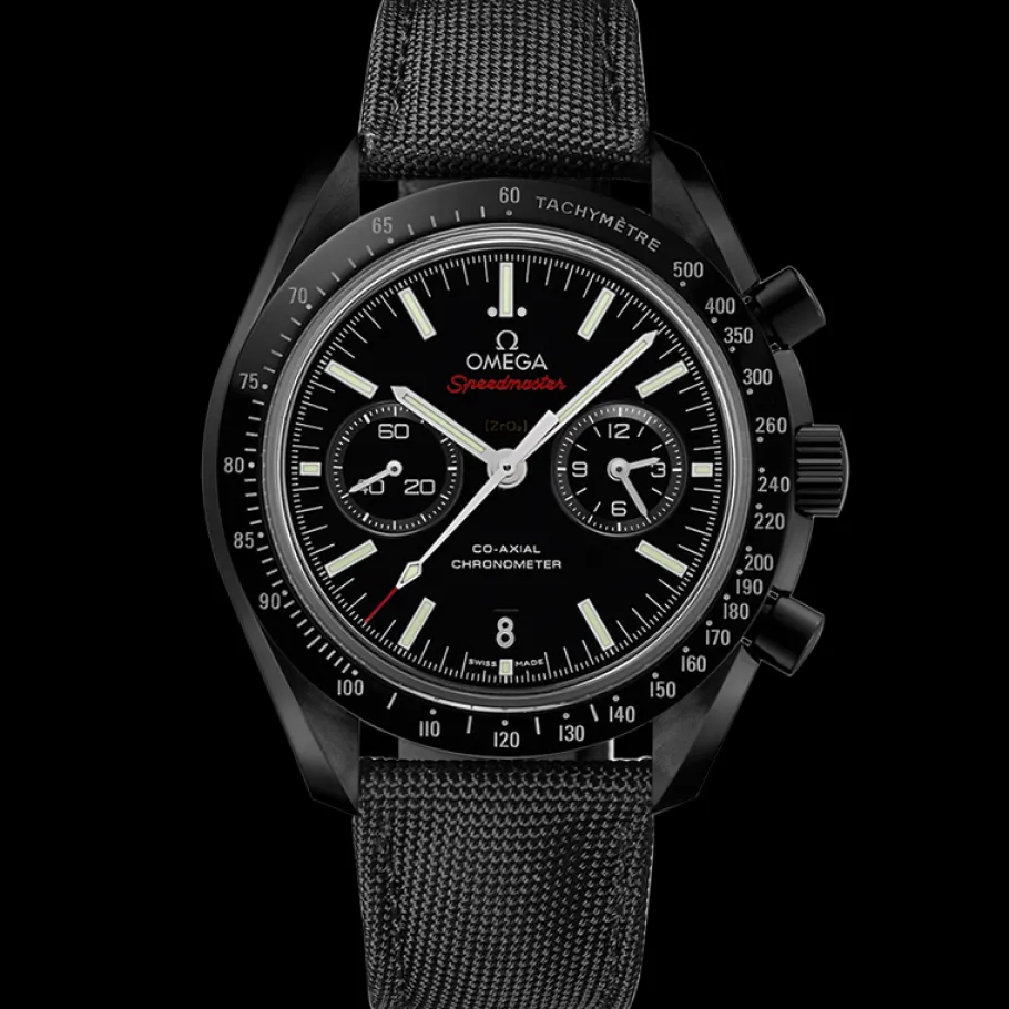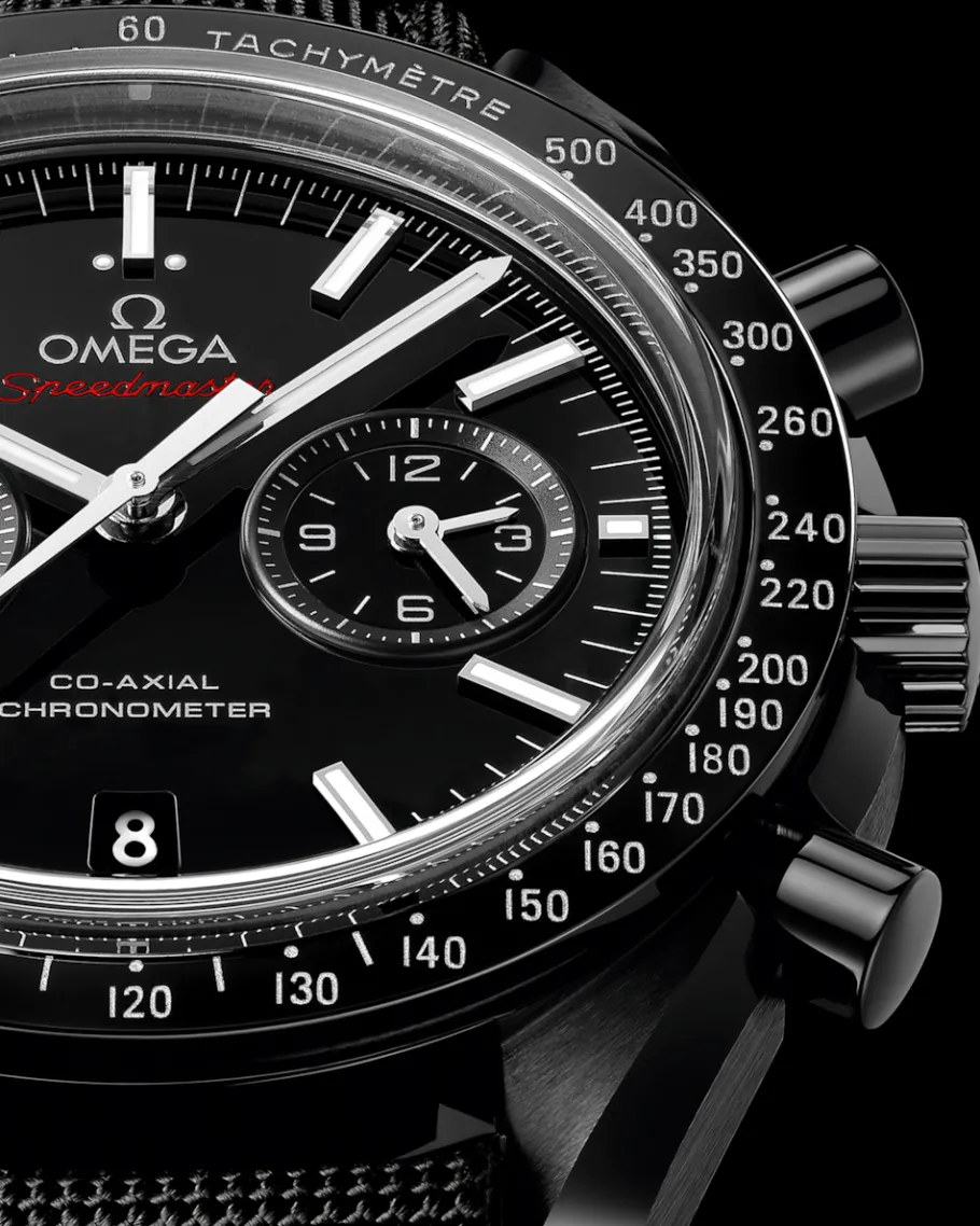 Animée par le calibre OMEGA Co-Axial 9300, cette montre audacieuse possède un bracelet en nylon noir et un nouveau fermoir repliable en céramique et titane. Les aiguilles sont en or blanc 18K polies au diamant, à l’exception de l’aiguille centrale des secondes à pointe rouge, polie et rhodiée.