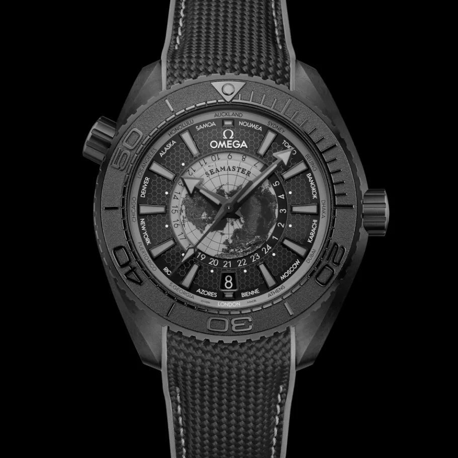 La partie extérieure du cadran est de couleur noir DLC avec un motif en nid d’abeille poli et gravé au laser. Elle comprend des index satinés au diamant et revêtus de Super-LumiNova gris, ainsi qu’un anneau extérieur en vernis gris. Diverses destinations mondiales entourent le cadran et son anneau extérieur, notamment la ville de Bienne, siège d’OMEGA, tandis que les aiguilles revêtues de PVD gris sont également revêtues de Super-LumiNova gris.