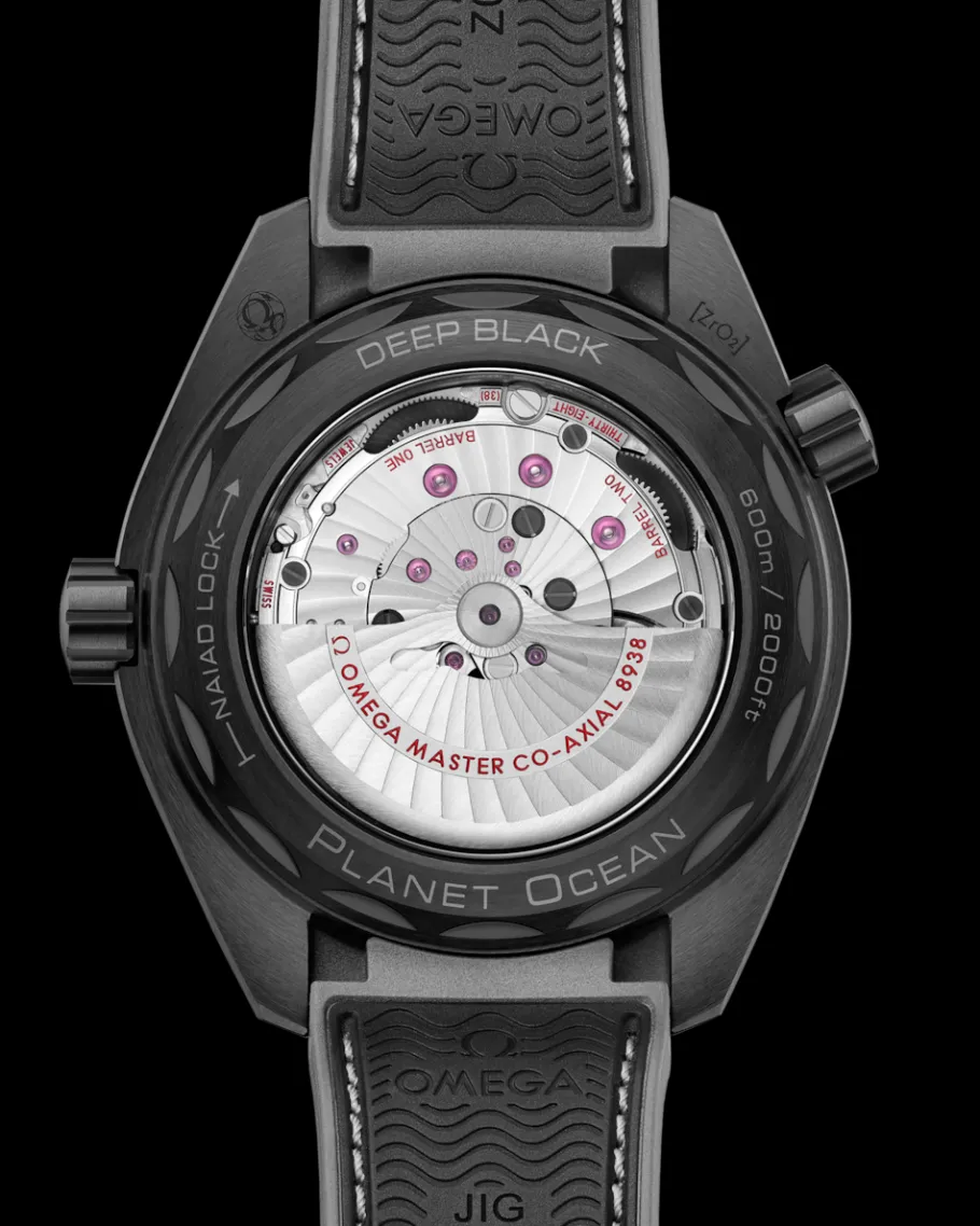 Cette Worldtimer se porte sur un bracelet intégré en caoutchouc noir structuré avec un dessous noir-gris, des surpiqûres grises et une boucle déployante en céramique et titane céramisé. À travers le fond de boîte en verre saphir, on observe le calibre Co-Axial Master Chronometer 8938 d’OMEGA qui anime la montre.