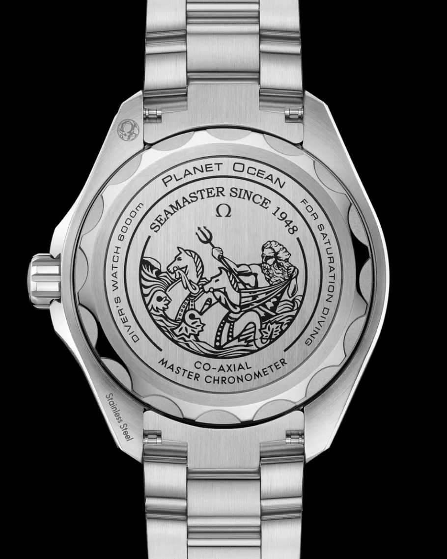 Le fond du boîtier arbore une version gravée au laser du logo Seamaster commémoratif illustrant Poséidon muni d’un trident et deux hippocampes : le logo original d’OMEGA datant de 1956 et le design actuel de la Maison. Ce modèle possède le calibre OMEGA Co-Axial Master Chronometer 8912.