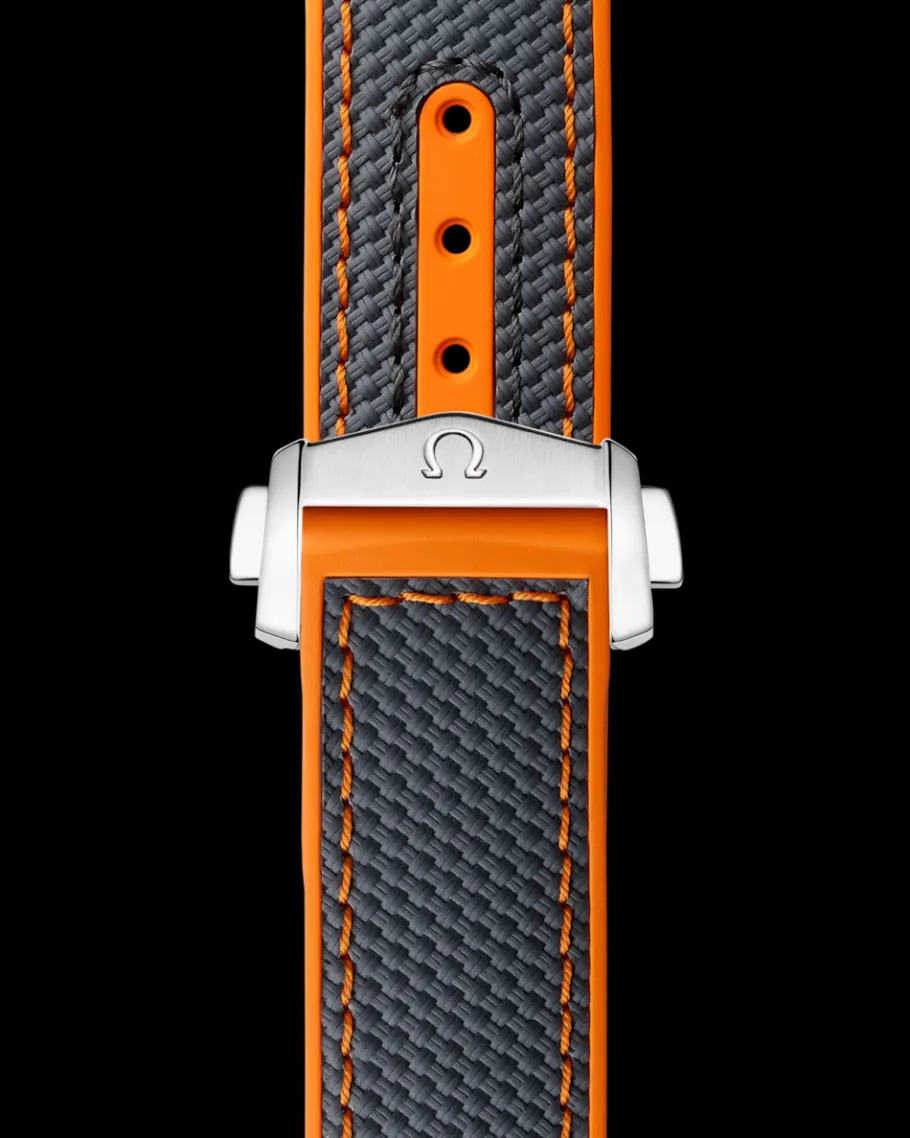 La montre se distingue également par son fond vissé au design alvéolaire et son bracelet en caoutchouc structuré gris avec surpiqûre et doublure orange.
