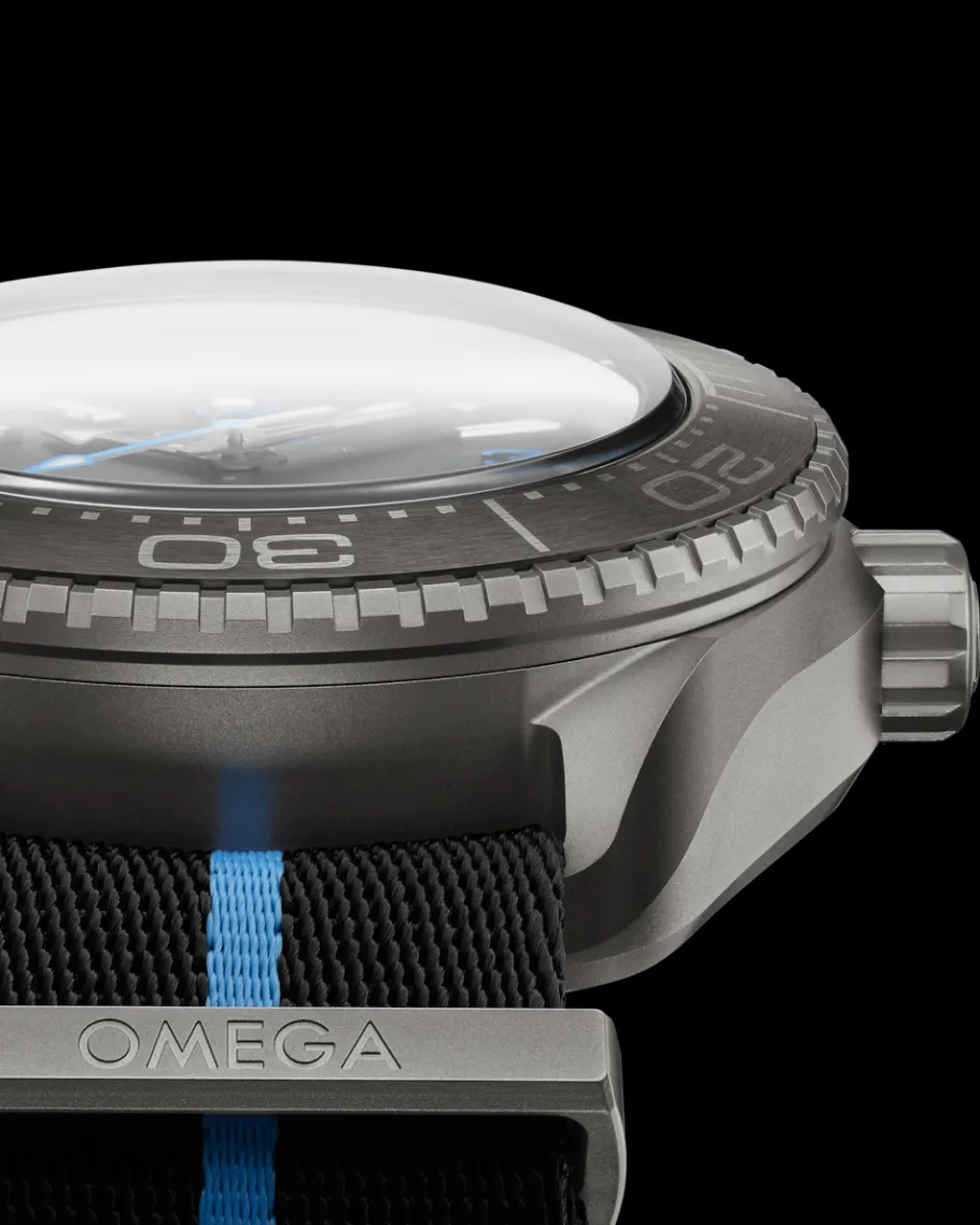La montre comporte à chaque extrémité des « cornes manta » caractéristiques qui se fixent à un bracelet NATO noir et cyan en polyamide doté d’une boucle en titane grade 5. Le fond du boîtier présente un médaillon en titane grade 5, qui porte l’emblème Sonar gravé au laser avec l’hippocampe OMEGA emblématique en son centre. La montre est animée par le mouvement OMEGA Co-Axial Master Chronometer 8912.