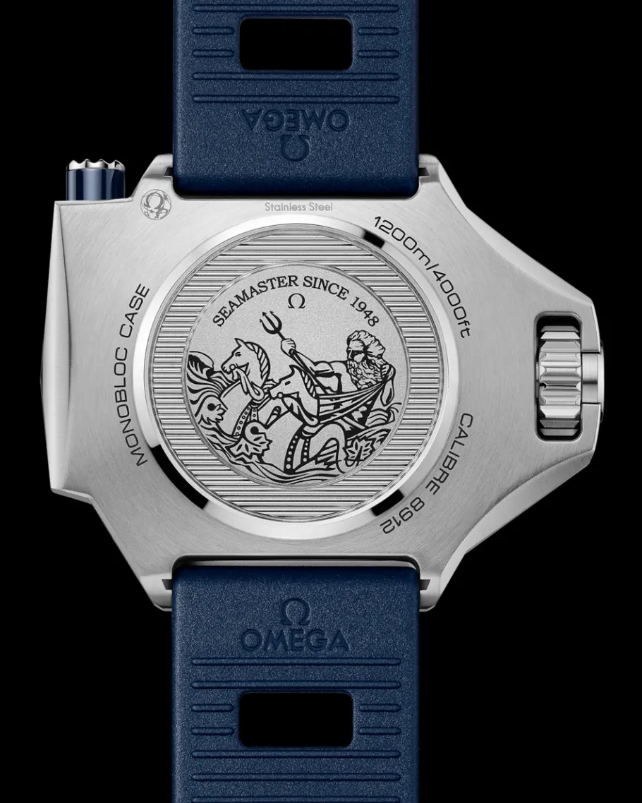 Le dos de la montre arbore une version gravée au laser du logo Seamaster commémoratif bordé de vagues gravées et illustrant Poséidon muni d’un trident et deux hippocampes : le logo original d’OMEGA datant de 1956 et le design actuel de la Maison. Ce modèle possède le calibre OMEGA Co-Axial Master Chronometer 8912. Un bracelet en caoutchouc bleu au style original vient compléter l’ensemble.