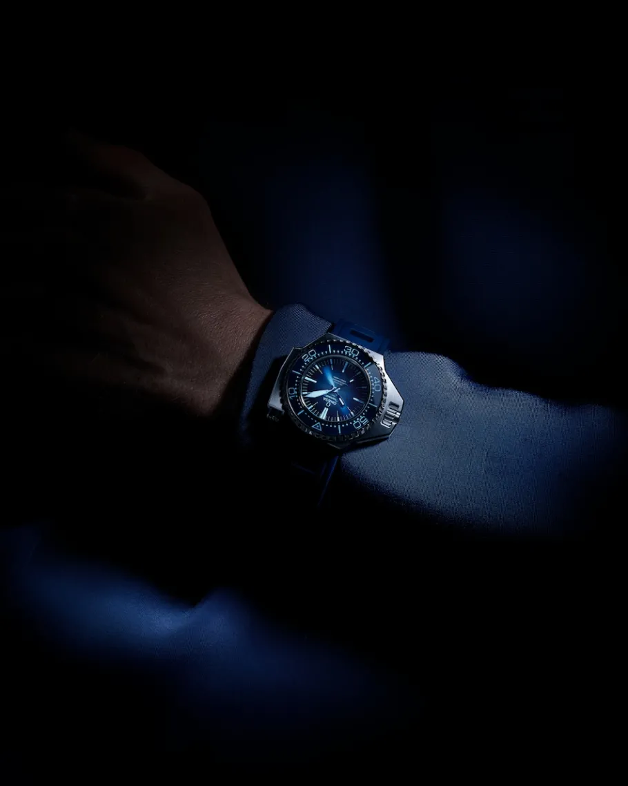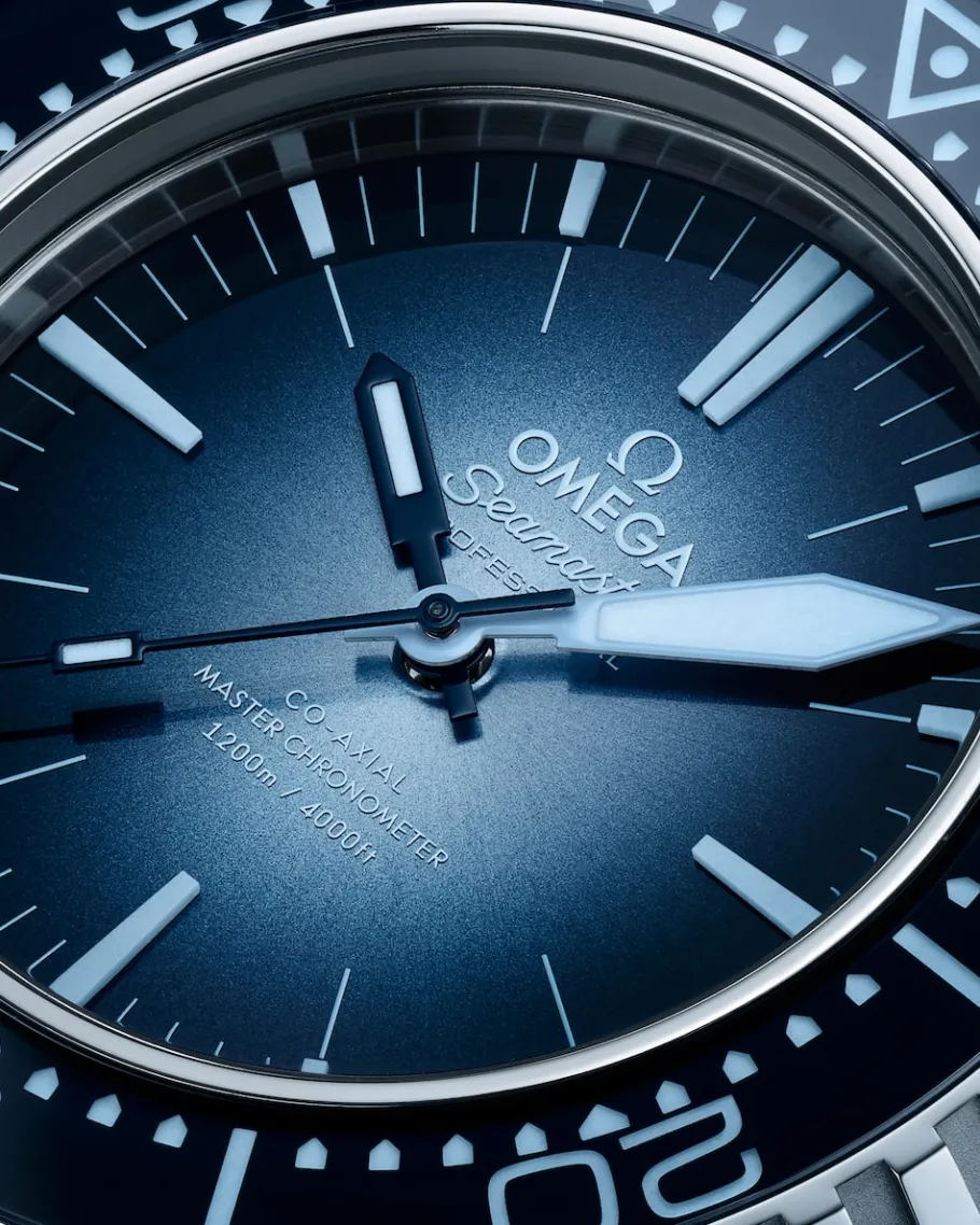 Confectionnée en O-MEGASTEEL, elle arbore un cadran soleillé bleu estival exclusif d’OMEGA avec une finition dégradée qui reflète le niveau d’étanchéité de la montre. La lunette est conçue en verre saphir transparent verni bleu au verso, pour révéler l’échelle de plongée bleu clair située en dessous.
