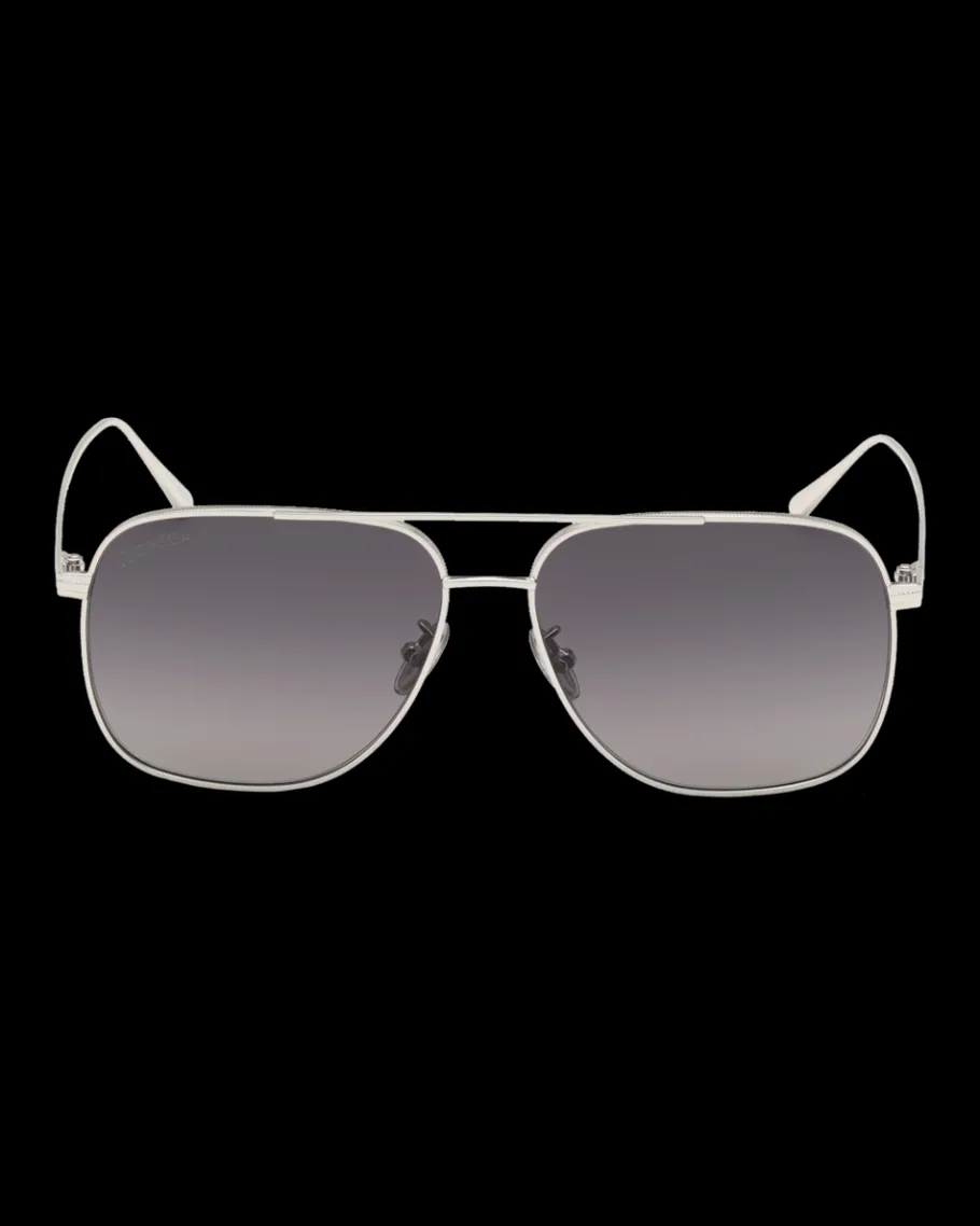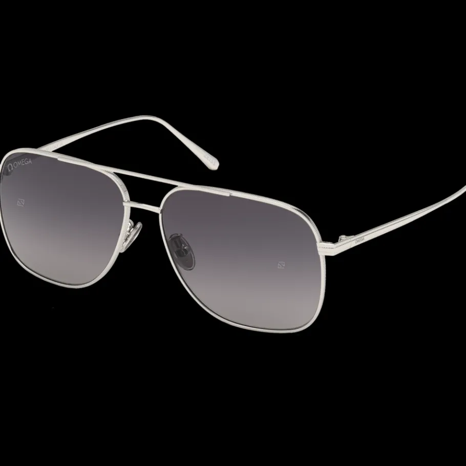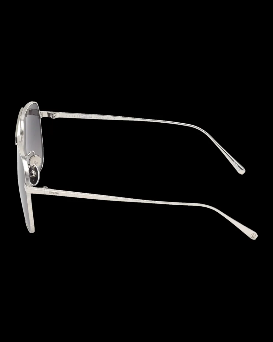 Lunettes style pilote qui se distinguent par une monture métallique, un double pont et des plaquettes personnalisées gravées du logo OMEGA.